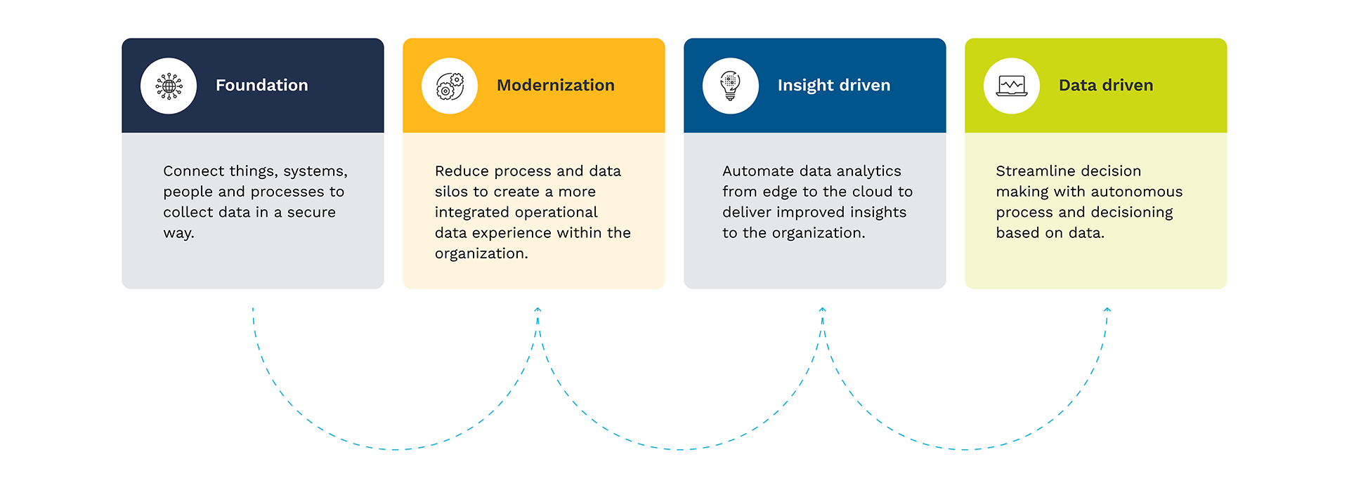 How we use data is changing. Business models are evolving at a rapid pace with advancements in data analytics, 5G, AI and IoT platform technologies. As a solutions aggregator, TD SYNNEX provides the expertise, aggregation and ecosystem enablement to simplify data-driven and IoT opportunities. Our programs, resources and offerings are supported across four key pillars of the digital transformation journey: Foundation, Modernization, Insight Driven and Data Driven.