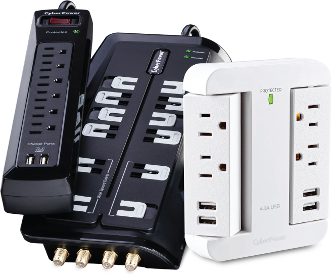 smartphones and tablets with surge protectors that fit any application. CyberPower offers a variety of surge protectors to provide additional outlets and surge protection for home and office environments. Select models include USB charge ports, long power cords, widely spaced outlets and swivel outlets for convenience.